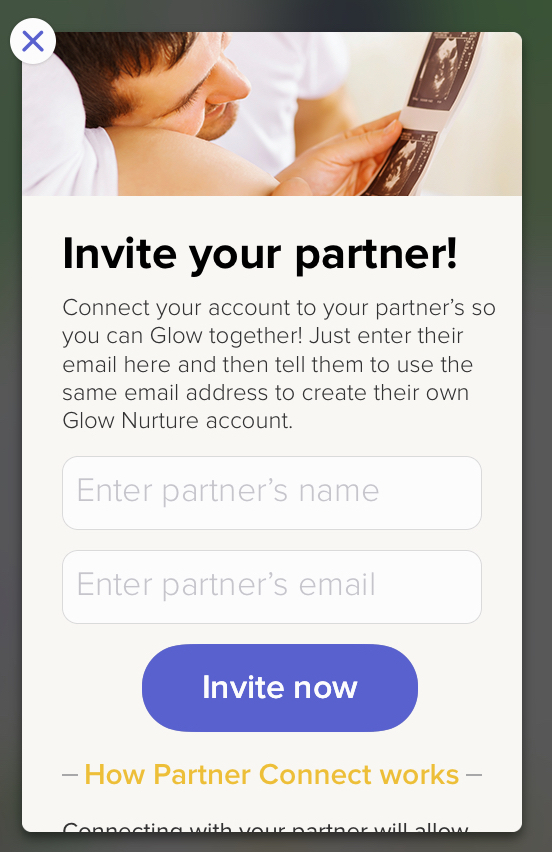 Input the email of your partner. If the partner already has a Glow account, be sure to use the correct email. If they are going to create an account, please tell them to be sure to use the email address that they were invited with.